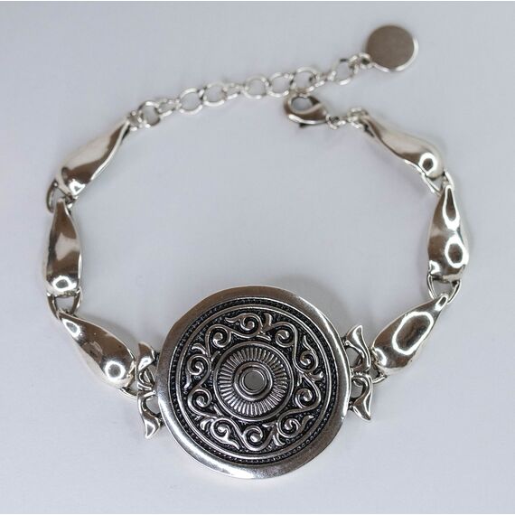 Браслет женский из гипоаллергенного ювелирного сплава серого и черного цвета. Без вставок. Высота центра подвески-3,0см, ширина-3,0см. Замок- карабин, размер- 18,0 с удлиняющей цепочкой.