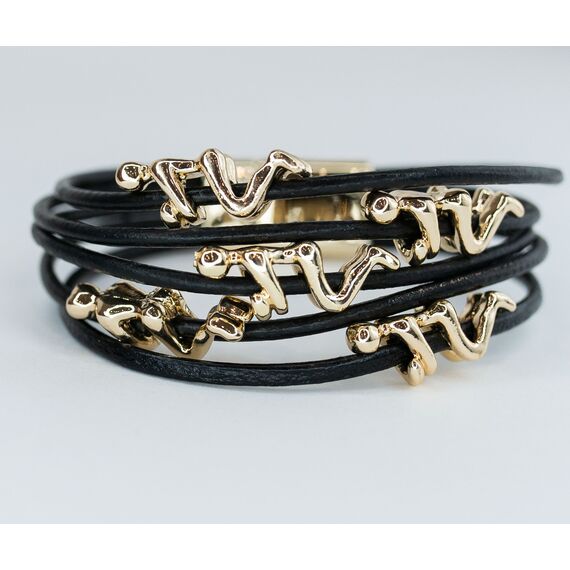 Браслет женский из гипоаллергенного ювелирного сплава желтого цвета и кожаных ремешков черного цвета. Без вставок. Высота браслета-3,0см. Размер-18,0. Замок- магнит.
