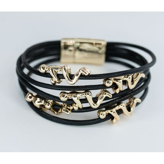 Браслет женский из гипоаллергенного ювелирного сплава желтого цвета и кожаных ремешков черного цвета. Без вставок. Высота браслета-3,0см. Размер-18,0. Замок- магнит.