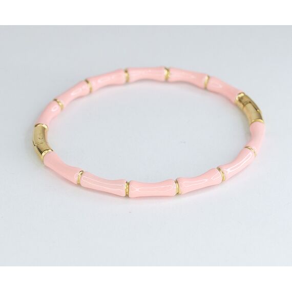 Браслет женский из гипоаллергенного ювелирного сплава желтого цвета и ювелирной смолы розового цвета. Без вставок. Высота браслета- 1,0см. Браслет жесткий, в виде обруча, разъёмный. Размер-18,0. Застежка- защелка.
