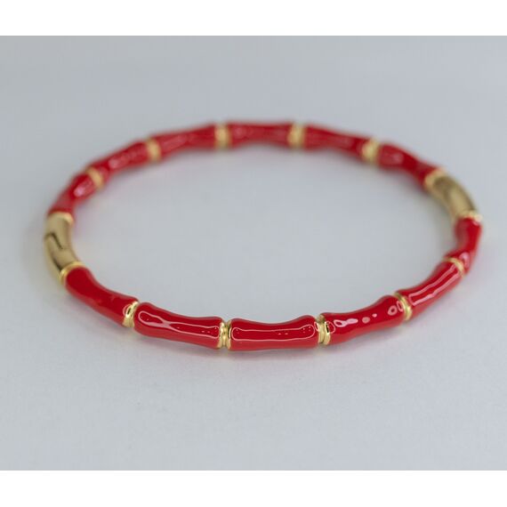 Браслет женский из гипоаллергенного ювелирного сплава желтого цвета и ювелирной смолы красного цвета. Без вставок. Высота браслета- 1,0см. Браслет жесткий, в виде обруча, разъёмный. Размер-18,0. Застежка- защелка.