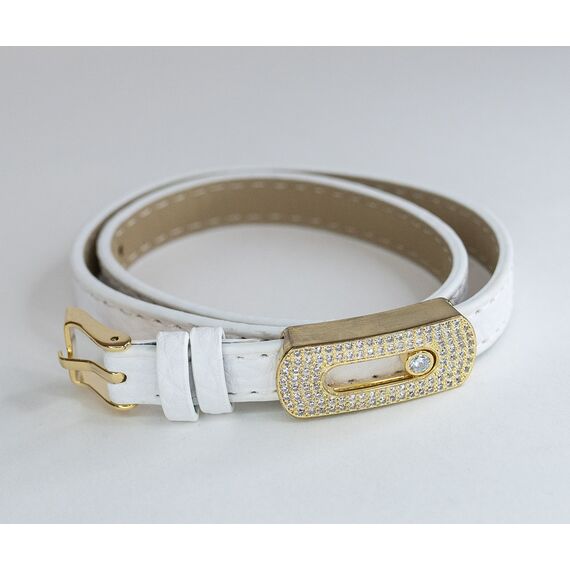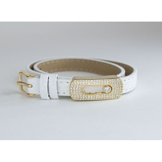 Браслет женский из гипоаллергенного ювелирного сплава желтого цвета и кожи черного цвета. Вставка- циркон белого цвета . Высота браслета- 2,0см. Кожаный ремешок обвивает руку два раза. Размер-18,0, регулируется. Застежка- пряжка.
