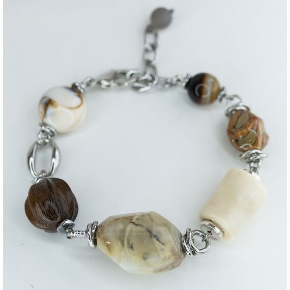 Браслет женский из гипоаллергенного ювелирного сплава серого цвета, бусин агата бело-бежевого цвета, дерева коричневого цвета и коралла оранжевого цвета. Размер бусин- 0,7-3,0см. Размер браслета-20,0-24,0; замок- карабин.