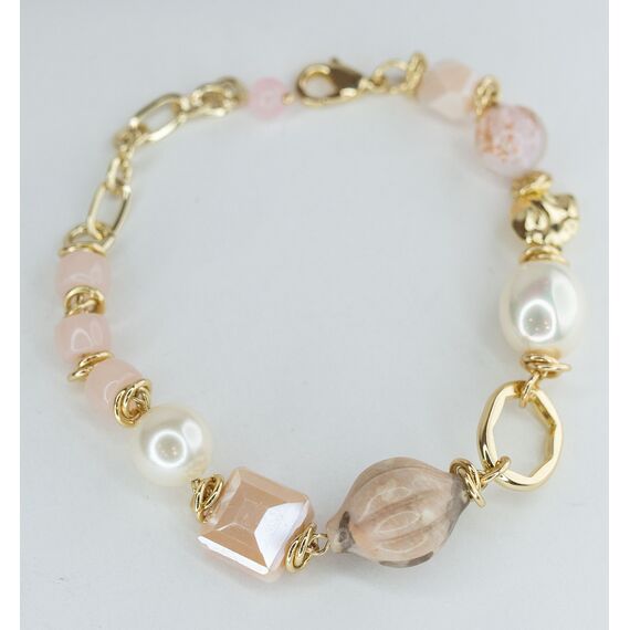 Браслет женский из гипоаллергенного ювелирного сплава желтого цвета, бусин майорки белого цвета, солнечника бежевого цвета и художественного стекла розового цвета. Размер бусин- 1,0-1,5см. Размер браслета-20,0-24,0; замок- карабин.