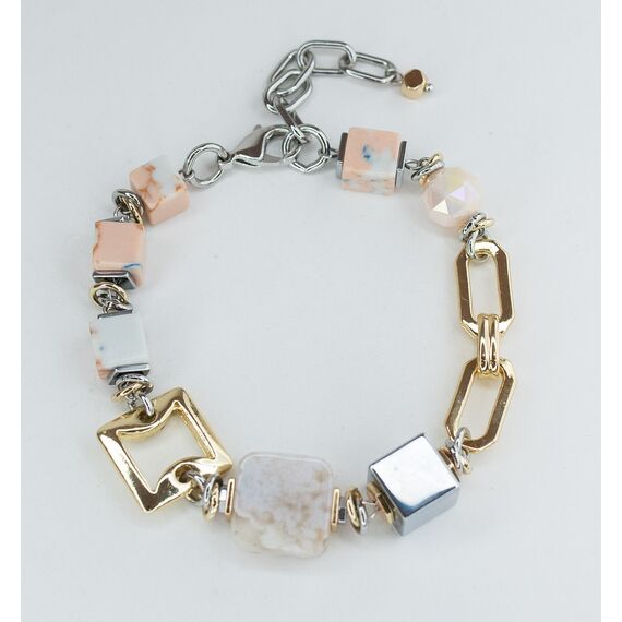 Браслет женский из гипоаллергенного ювелирного сплава серого цвета, бусин гематита серого цвета, варисцита белого цвета и агата бежевого цвета. Размер бусин-1,0-2,5см. Размер браслета-20,0-24,0; замок- карабин.