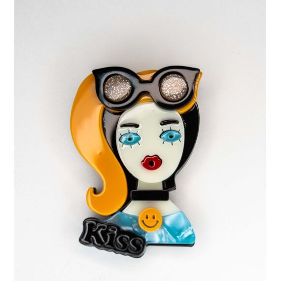 Брошь женская из гипоаллергенного ювелирного пластика, цвет- черный, оранжевый, голубой, белый. Высота брошки-6см, ширина-4см. Застежка- булавка.
