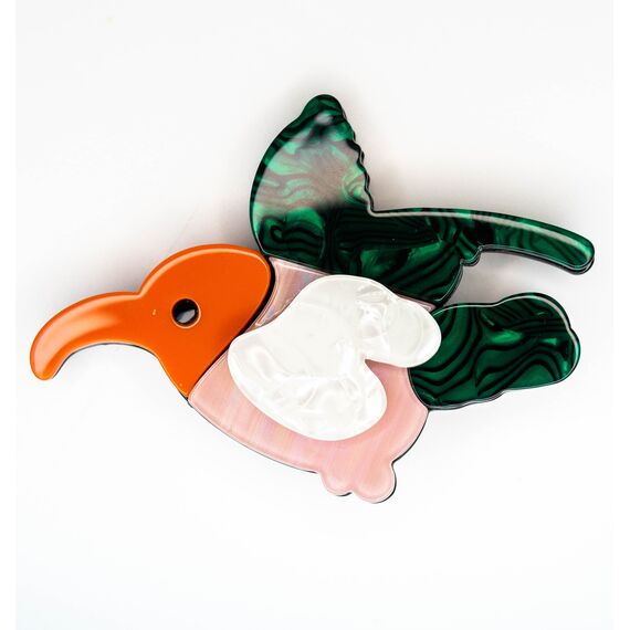 Брошь женская из гипоаллергенного ювелирного пластика белого, зеленого, розового, оранжевого и черного цвета. Высота броши-5,5см, ширина-8см. Застежка- булавка.