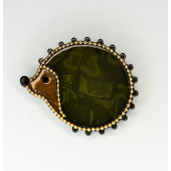 Брошь из гипоаллергенного ювелирного пластика, цвет- желтый, зеленый, коричневый. Высота брошки-3,5см, ширина-4,5см. Застежка- булавка из серого ювелирного сплава.