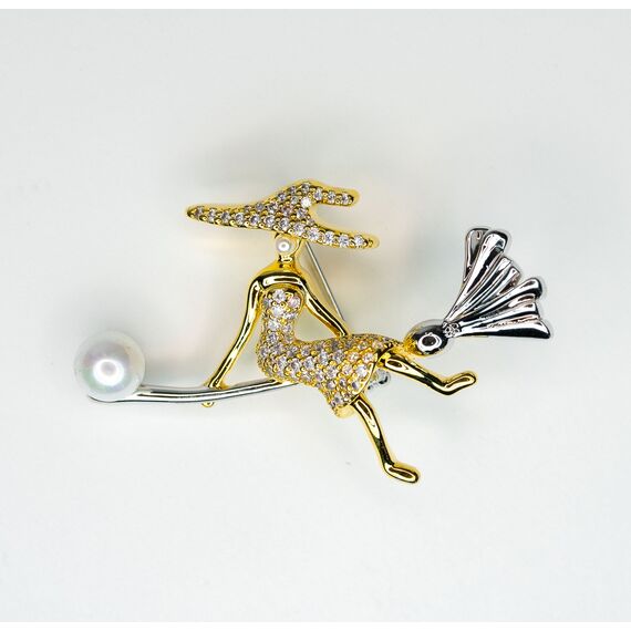 Брошь из гипоаллергенного ювелирного сплава желтого и серого цвета. Вставка-ювелирное стекло и иск. жемчуг белого цвета. Высота броши- 3,0см, ширина-4,0см. Застежка- булавка