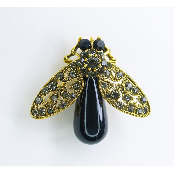Брошь женская из гипоаллергенного ювелирного сплава желтого цвета и пластика черного цвета. Вставка- ювелирное стекло серого цвета. Высота брошки-3,0см, ширина-3,5см. Застежка- булавка.