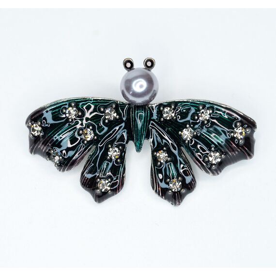 Брошь из гипоаллергенного ювелирного сплава серого цвета. Вставка- ювелирное стекло и иск. жемчуг серого цвета. Покрытие эмалью, цвет- коричневый, зеленый. Высота броши-3,0см, ширина-5,0см. Застежка- булавка.