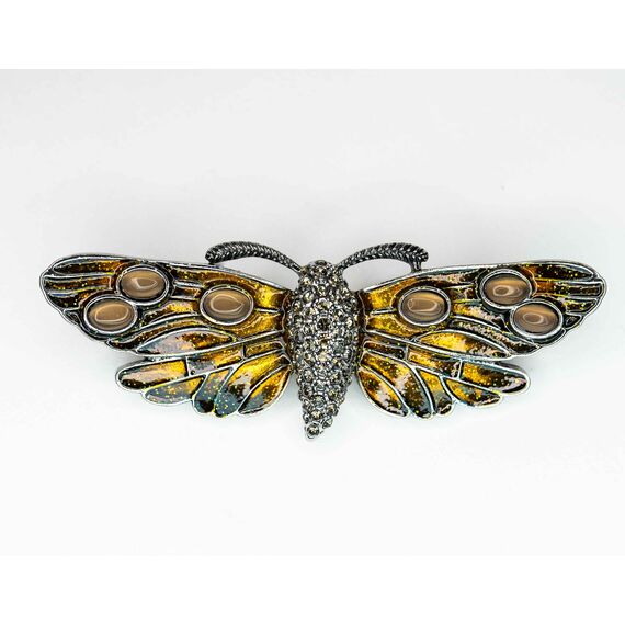 Брошь женская из гипоаллергенного ювелирного сплава серого цвета с покрытием эмалью коричневого цвета. Вставка- ювелирное стекло белого цвета и улексит, цвет- коричневый. Высота броши- 3,0см, ширина- 5,0см. Застежка- булавка.