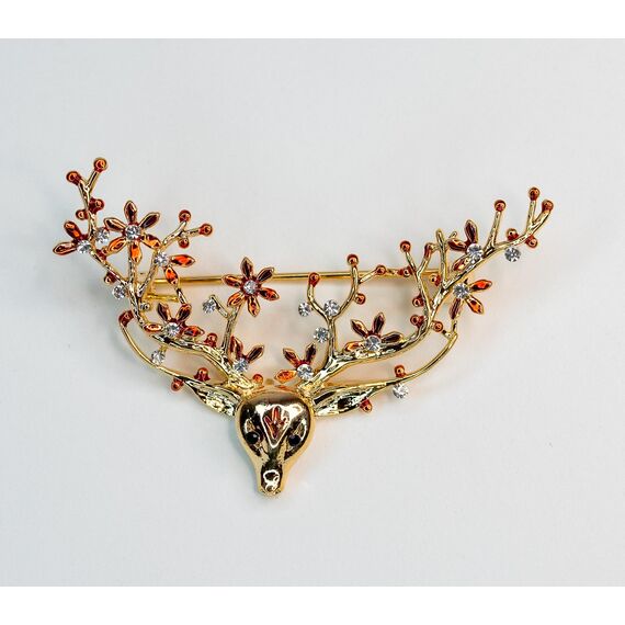 Брошь из гипоаллергенного ювелирного сплава желтого цвета. Вставка- ювелирное стекло белого цвета. Покрытие эмалью, цвет- красный. Высота брошки-3см, ширина-5см. Застежка- булавка.