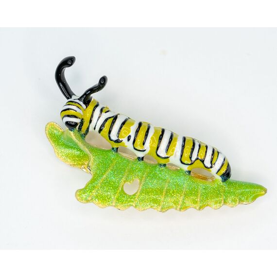 Брошь из гипоаллергенного ювелирного сплава желтого цвета. Покрытие эмалью зеленого, белого и черного цвета. Высота броши-2,5см, ширина-5см. Застежка- булавка.