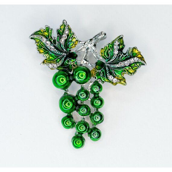 Брошь из гипоаллергенного ювелирного сплава серого цвета. Покрытие эмалью зеленого цвета. Вставка- ювелирное стекло белого цвета. Высота броши-3,5см, ширина-3,5см. Застежка- булавка.