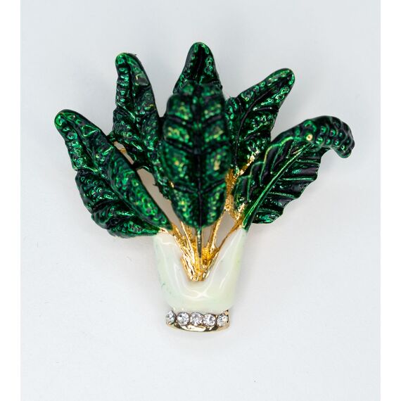 Брошь из гипоаллергенного ювелирного сплава желтого цвета. Покрытие эмалью зеленого и белого цвета. Вставка- ювелирное стекло белого цвета. Высота броши-4см, ширина-4см. Застежка- булавка.