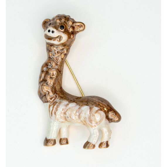 Брошь женская из гипоаллергенного ювелирного сплава желтого цвета. Без вставок. Покрытие эмалью, цвет- коричневый, белый. Высота броши-5см, ширина-3,5см. Застежка- булавка.