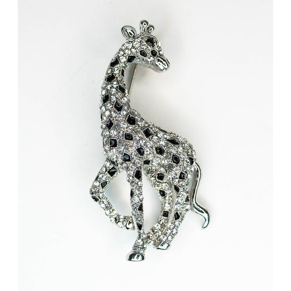 Брошь женская из гипоаллергенного ювелирного сплава серого цвета. Вставка- ювелирное стекло белого цвета. Покрытие эмалью, цвет- черный. Высота броши-6см, ширина-3см. Застежка- булавка.
