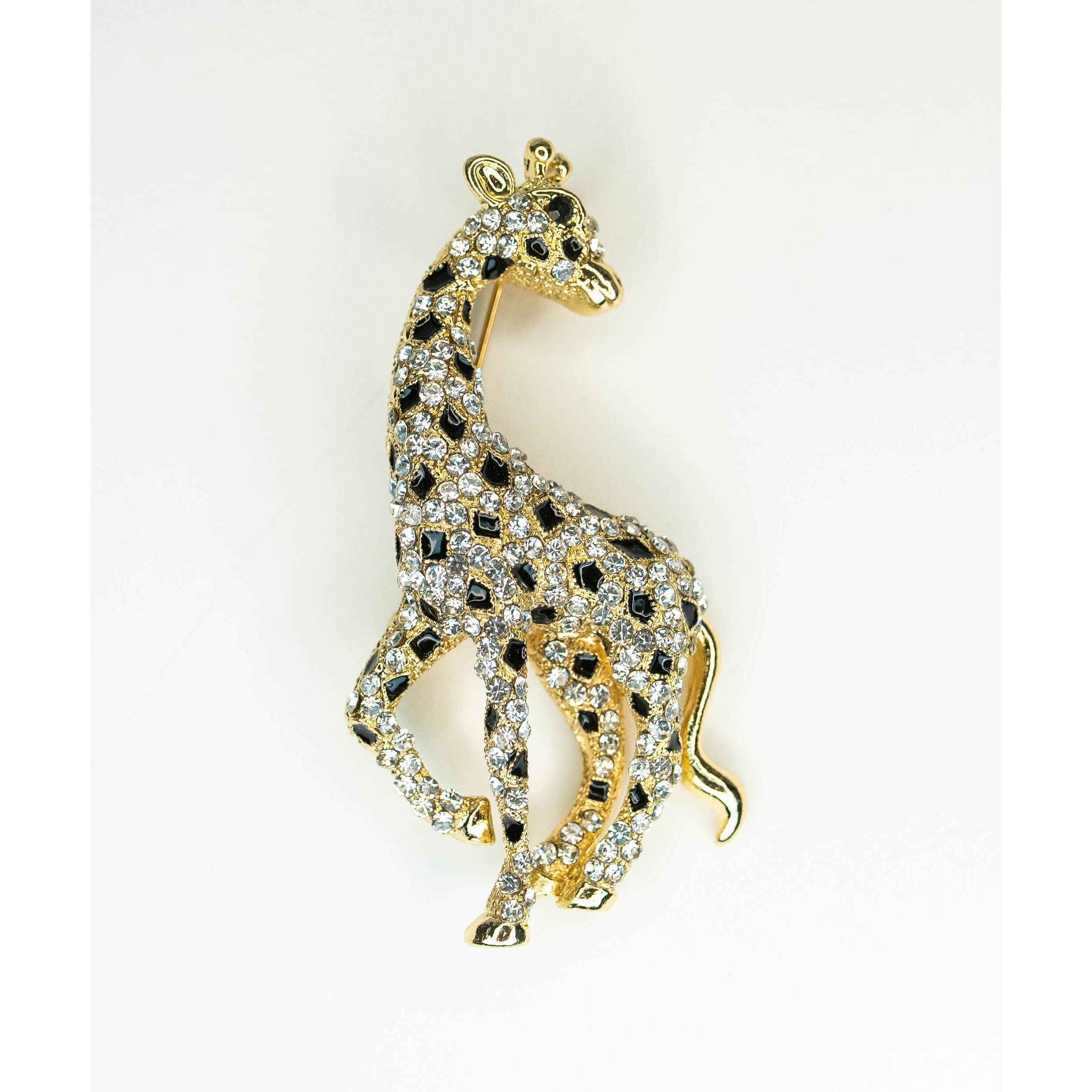 Брошь женская из гипоаллергенного ювелирного сплава желтого цвета. Вставка- ювелирное стекло белого цвета. Покрытие эмалью, цвет- черный. Высота броши-6см, ширина-3см. Застежка- булавка.