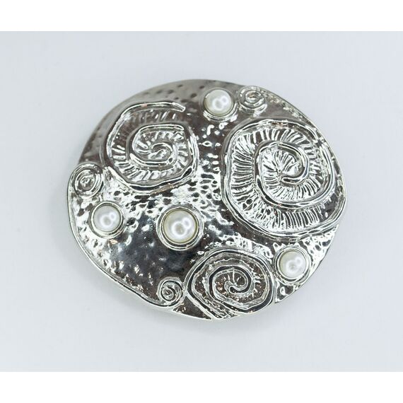 Брошь женская из гипоаллергенного ювелирного сплава серого цвета. Вставка- жемчуг иск., цвет- белый. Высота броши- 5,0см, ширина- 5,0см. Замок- магнит.
