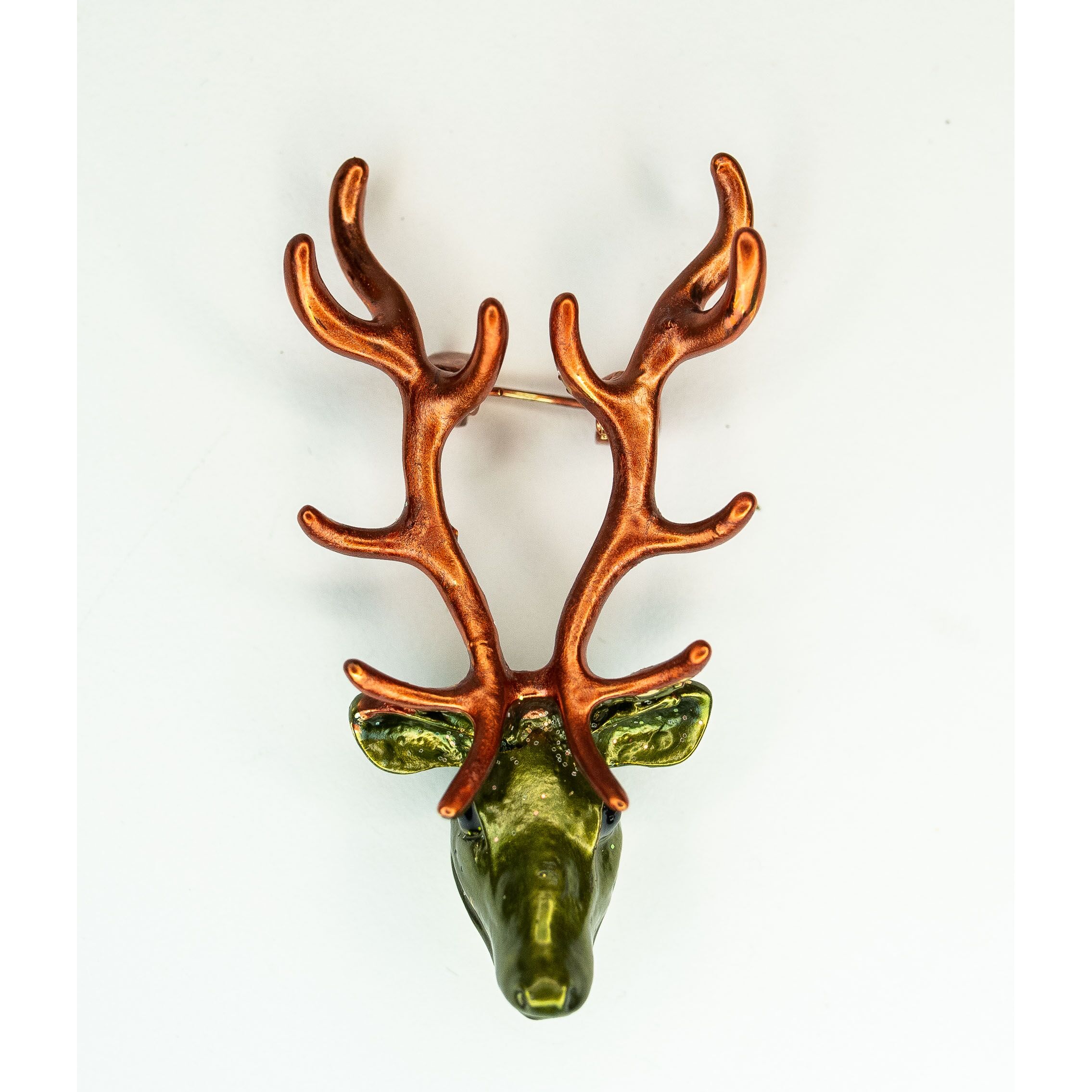 Брошь из гипоаллергенного ювелирного сплава желтого цвета. Покрытие эмалью, цвет- коричневый, зеленый. Высота броши-6см, ширина-3см. Застежка- булавка.