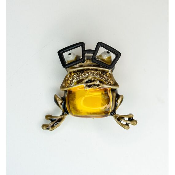 Брошь из гипоаллергенного ювелирного сплава желтого цвета. Вставка- ювелирное стекло, цвет- бежевый. Покрытие эмалью, цвет- желтый и черный. Высота броши-3,0см, ширина-3,5см. Застежка- булавка.