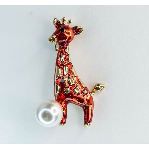 Брошь из гипоаллергенного ювелирного сплава желтого цвета. Покрытие эмалью красного цвета. Вставка- ювелирное стекло, цвет- черный и жемчуг иск.,цвет- белый. Высота броши-4,5см, ширина-3,0см. Застежка-булавка.