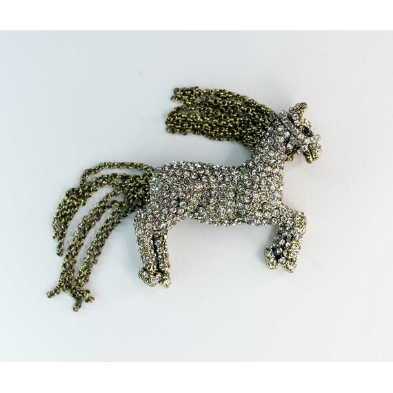 Брошь из гипоаллергенного ювелирного сплава бронзового цвета. Вставка- ювелирное стекло белого цвета. Грива и хвост выполнены из якорных цепочек. Высота брошки-4,5см, ширина-4,5см. Застежка- булавка.