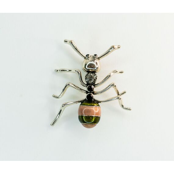 Брошь из гипоаллергенного ювелирного сплава серого цвета. Вставка- ювелирное стекло, цвет- белый и черный. Покрытие эмалью розового и зеленого цвета. Высота брошки-5,0см, ширина-4,5см. Застежка- булавка.