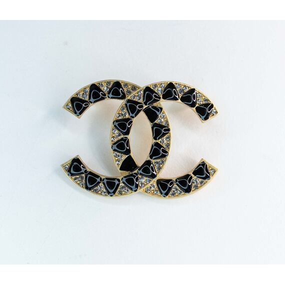 Брошь из гипоаллергенного ювелирного сплава желтого цвета. Вставка- ювелирное стекло белого цвета. Покрытие эмалью, цвет- черный. Высота броши-3,5см, ширина-5,0см. Застежка- булавка.