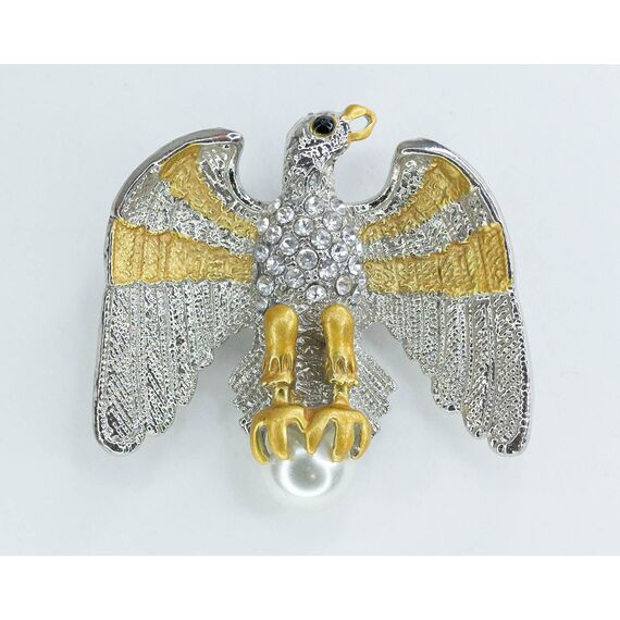 Брошь из гипоаллергенного ювелирного сплава серого и желтого цвета. Вставка- ювелирное стекло и жемчуг иск., цвет- белый. Высота брошки-5,0см, ширина-4,0см. Застежка- булавка.