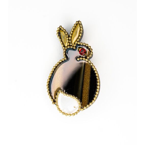 Брошь из гипоаллергенного ювелирного сплава серого, желтого цвета и пластика, цвет-черный, коричневый, белый. Вставка- ювелирное стекло красного цвета. Высота броши-5,5см, ширина-3см. Застежка- булавка.
