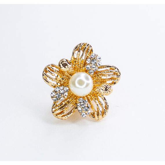 Брошь женская из гипоаллергенного ювелирного сплава желтого цвета. Вставка- ювелирное стекло и иск. жемчуг белого цвета. Высота брошки-2,0см, ширина-2,0см. Застежка- бабочка ( цанговый зажим).