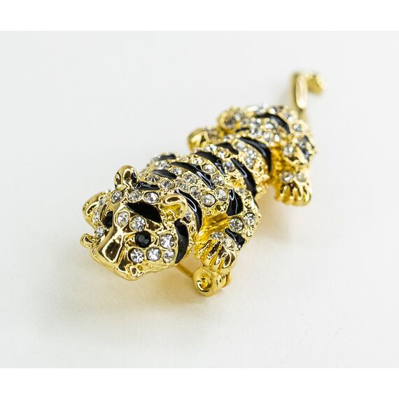 Брошь-кулон из гипоаллергенного ювелирного сплава желтого цвета. Вставка- ювелирное стекло белого цвета. Покрытие эмалью черного цвета. Высота броши-6см, ширина-2см. Хвостик- подвижная часть брошки. Застежка- булавка.