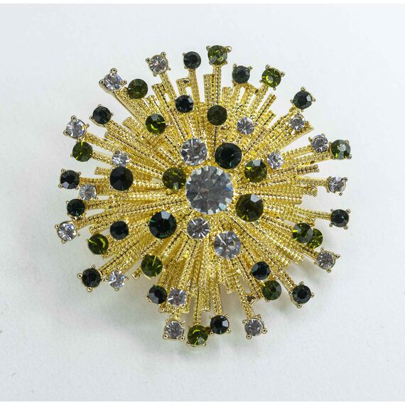 Брошь из гипоаллергенного ювелирного сплава желтого цвета. Вставка- ювелирное стекло белого и зеленого цвета. Высота броши-5,0см, ширина-5,0см. Застежка- булавка.