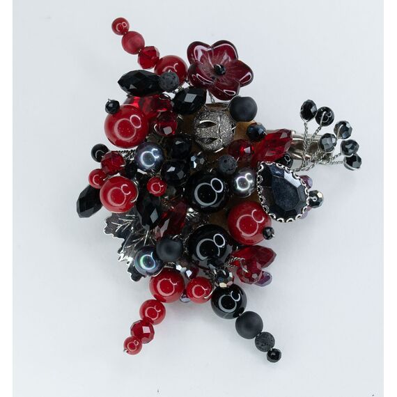 Брошь женская из гипоаллергенного ювелирного сплава серого цвета. Вставка- сердолик, цвет- красный и кварц черного и красного цвета. Высота броши-7,0см, ширина-7,0см. Замок- булавка и зажим.