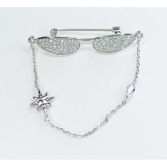 Брошь из гипоаллергенного ювелирного сплава, цвет- серый. Вставка- цирконы белого цвета. Высота броши-1,0см, ширина-4,0см. Брошка дополнена цепочкой, длиной-8,0см. Застежка -булавка.