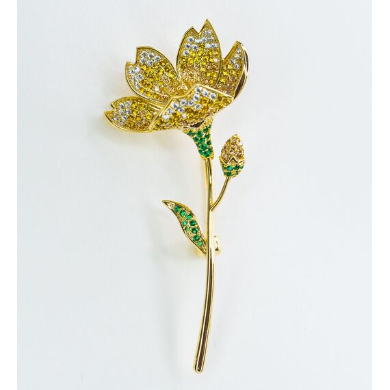Брошь из гипоаллергенного ювелирного сплава желтого цвета. Вставка- цирконы , цвет- белый и зеленый. Высота броши-6,5см, ширина-3,0см. Застежка- булавка.