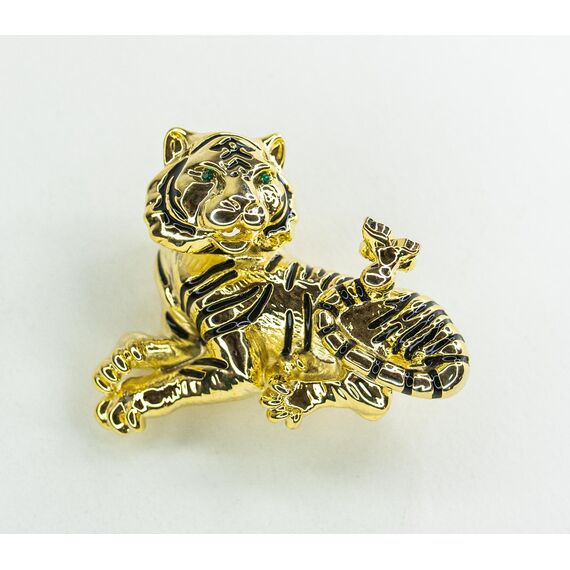 Брошь из гипоаллергенного ювелирного сплава желтого цвета. Вставка- ювелирное стекло зеленого цвета. Покрытие эмалью, цвет- черный. Высота брошки-3см, ширина-4,5см. Застежка- булавка.