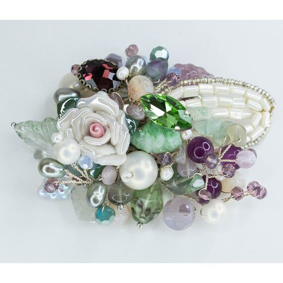 Брошь из гипоаллергенного ювелирного сплава серого цвета со вставками из белого жемчуга, фиолетового кварца и зеленого флюорита. Высота и ширина броши-6,0см. Застежка- булавка.
