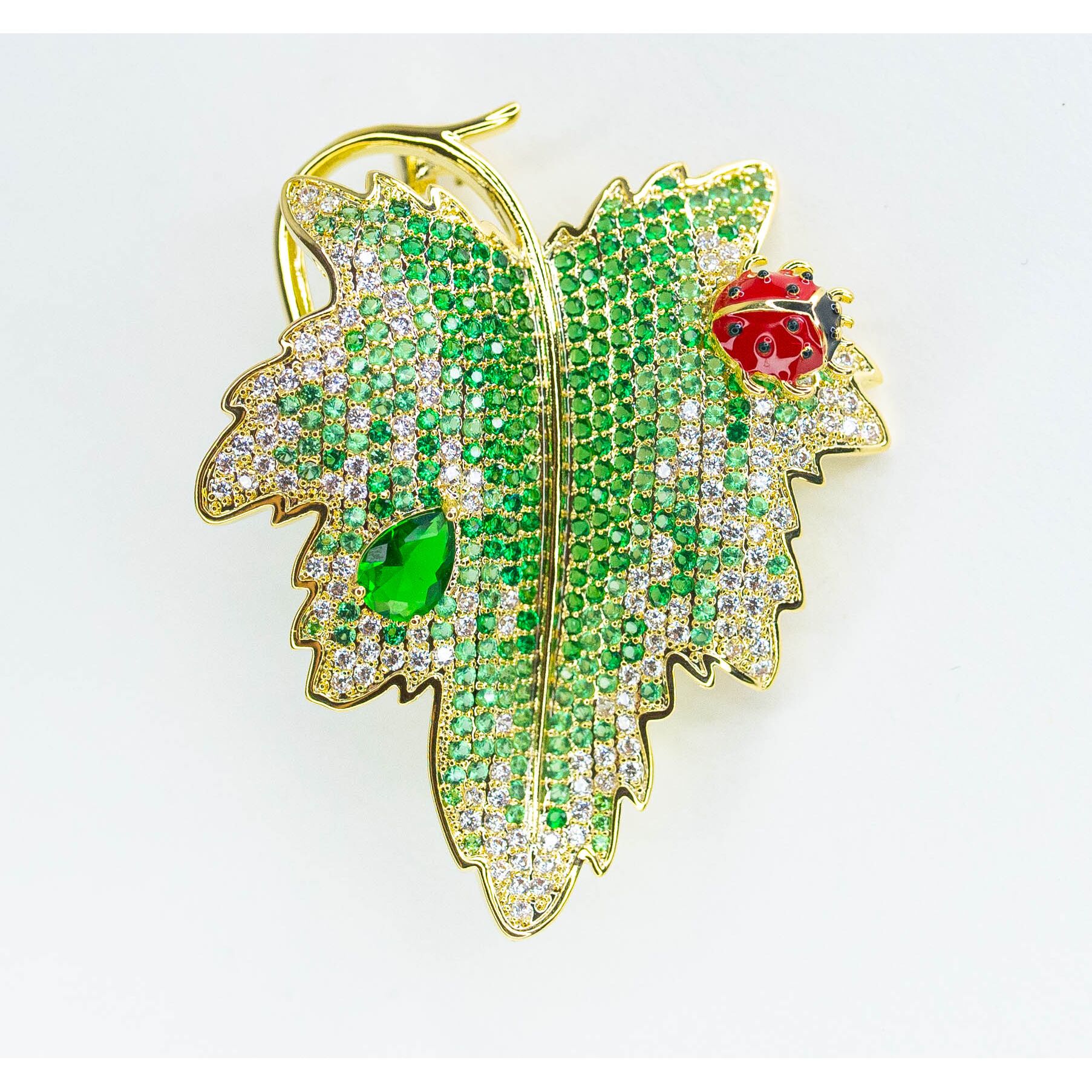 Брошь из гипоаллергенного ювелирного сплава желтого цвета. Вставка- цирконы белого и зеленого цвета. Высота броши-5,0см, ширина-3,5см. Застежка- булавка.