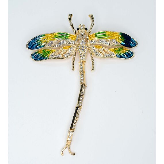 Брошь из гипоаллергенного ювелирного сплава желтого цвета. Покрытие эмалью желтого, голубого, салатового цвета. Вставка- ювелирное стекло , цвет- белый. Нижняя часть брошки (хвост)- подвижная. Высота броши-10,0см, ширина-8,0см. Застежка- булавка.