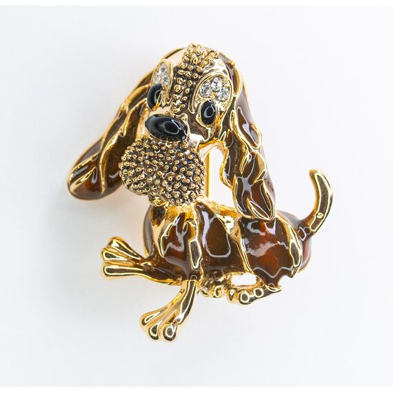 Брошь женская из гипоаллергенного ювелирного сплава желтого цвета. Вставка- ювелирное стекло белого цвета. Покрытие эмалью коричневого цвета. Высота брошки-4,0см, ширина-3,5см. Застежка- булавка.