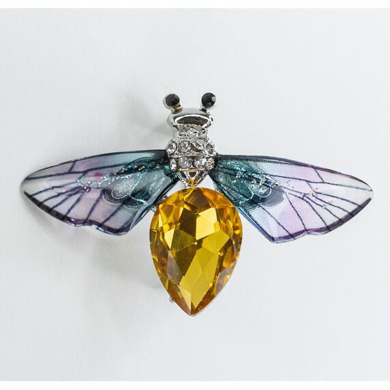 Брошь женская из гипоаллергенного ювелирного сплава серого цвета и эпоксидной смолы, цвет- фиолетовый. Вставка- ювелирное стекло белого и желтого цвета. Высота брошки-3см, ширина-4,5см. Застежка- булавка.