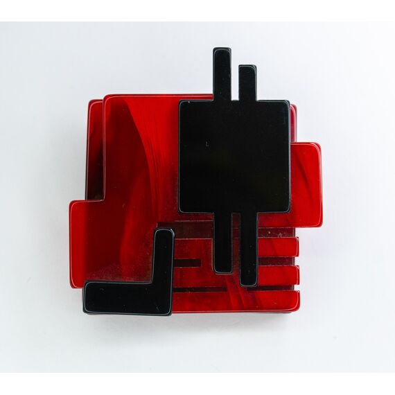 Брошь из гипоаллергенного ювелирного пластика, цвет- черный и красный. Высота брошки-5,5см, ширина-5,5см. Застежка- булавка из желтого ювелирного сплава.