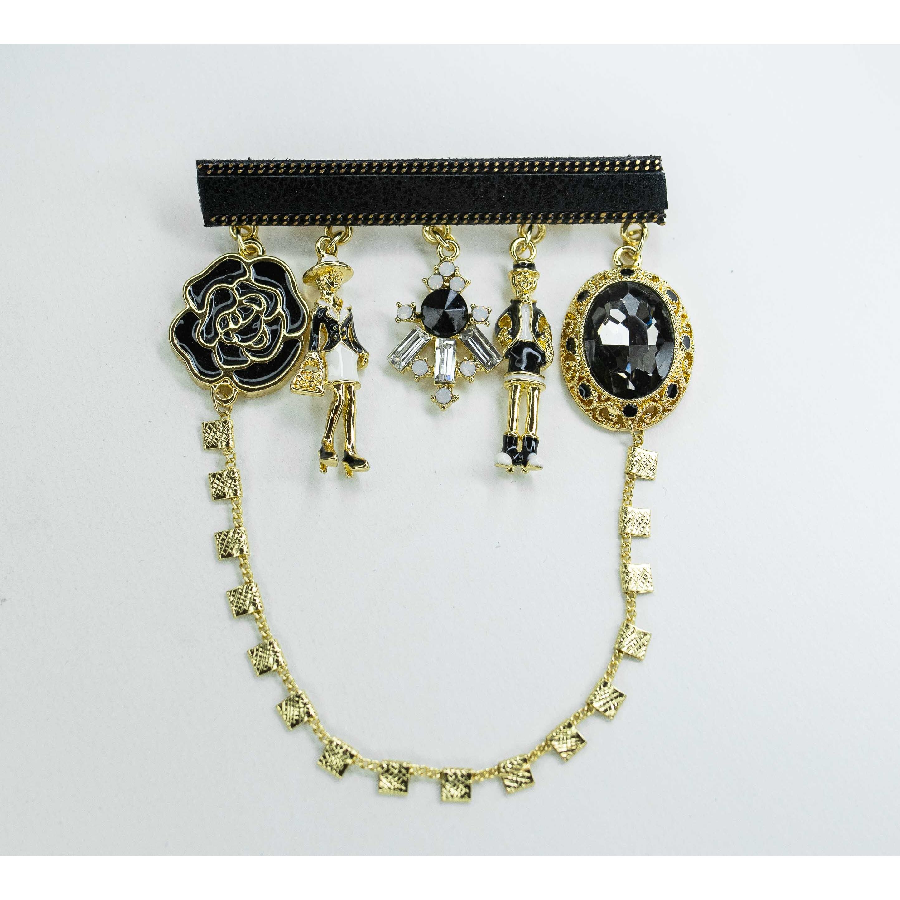 Брошь из гипоаллергенного ювелирного сплава, цвет- желтый и черного текстиля. Вставка- ювелирное стекло белого и черного цвета. Подвески покрыты эмалью белого и черного цвета. Высота брошки-9см, ширина-6,5см. Застежка- булавка.