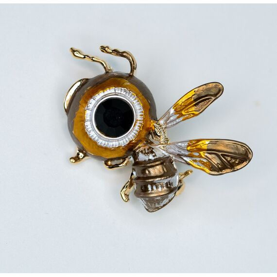 Брошь из гипоаллергенного ювелирного сплава желтого цвета. Вставка- ювелирное стекло черного цвета. Покрытие эмалью, цвет- коричневый, желтый. Высота броши-3,0см, ширина-3,5см. Застежка- булавка.
