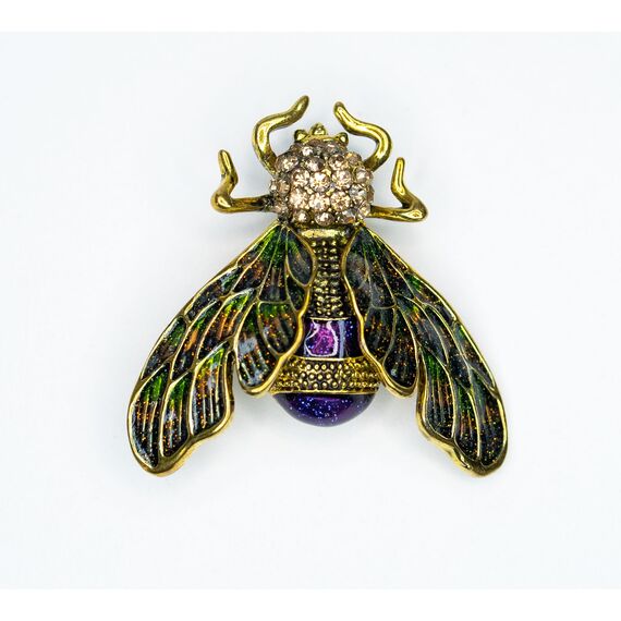 Брошь из гипоаллергенного ювелирного сплава желтого цвета. Вставка- ювелирное стекло желтого цвета. Покрытие эмалью, цвет- зеленый, фиолетовый. Высота броши-3,0см, ширина-3,5см. Застежка- булавка.