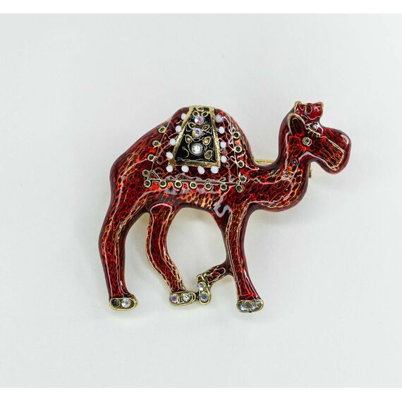Брошь из гипоаллергенного ювелирного сплава желтого цвета. Покрытие эмалью красного цвета. Вставка- ювелирное стекло, цвет- мистик. Высота броши-3,5см, ширина-4,5см. Застежка-булавка.