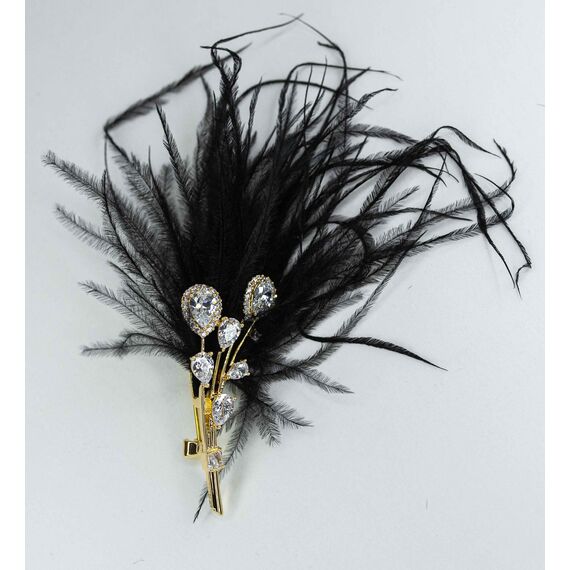 Брошь из гипоаллергенного сплава и страусиного пера черного цвета. Вставка - цирконы белого цвета. Высота броши -2см, длина -4.5см. Замок- булавка.